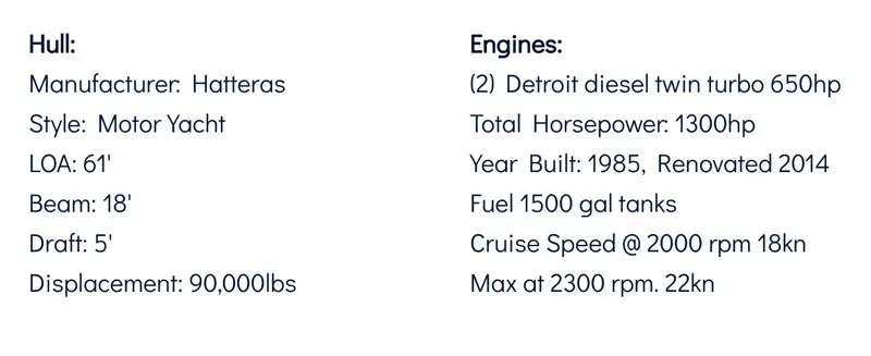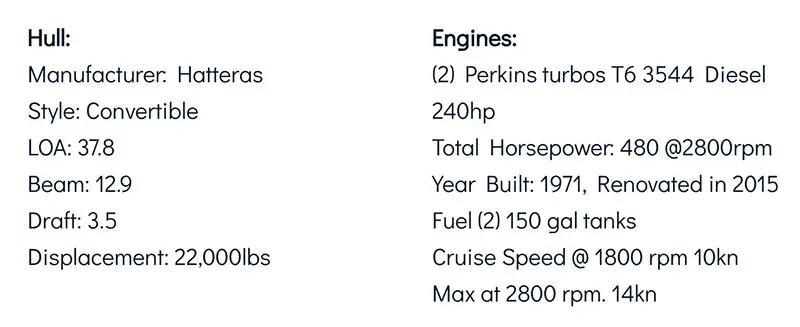 HATTERASS is a completely restored 1971, 36 ft Hatteras. The 36 is one of the most sought after boats Hatteras made, even today. She is stable and spacious with plenty of places to get in to and out of the sun. Take in the sights and watch for dolphins on your private and intimate cruise of the harbor. Head up to the fly bridge to socialize with the captain and crew or retreat to the main deck for a more private setting. Some great features of Hatterass are: