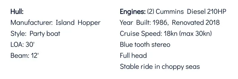 This 30' party boat boasts plenty of space to move around and dance. It has a big swim platform and boarding ladder for easy water access but a great feature often overlooked is the bathroom on board. This especially comes in handy on a party boat. No need to head to shore for a bathroom break or being uncomfortable on the boat. Fun, easy going, knowledgable captain included. Some great features of Ship of Fools are: