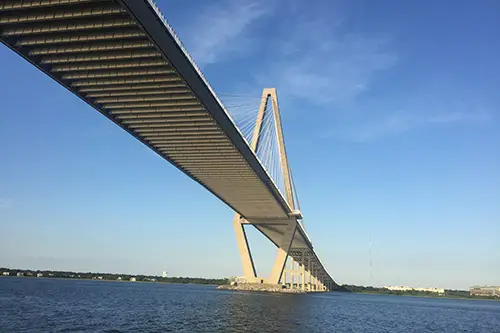 From there you can get some great views of the harbor, and of the Ravenel Bridge as well as Castle Pinckney in the foreground and a little further off in the distance Fort Sumpter. You can also see on many of the plaques in the park where everything is in the harbor. We actually bring you to those sites, right up close, and tell you about the history and what went on during the civil war and beyond. Its a much more interactive experience.