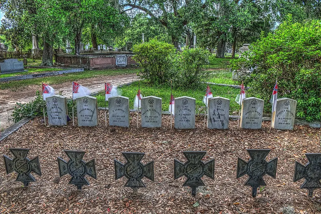 The remains of the entire eight-man crew were found resting peacefully at their stations. On April 17, 2004, a memorial service at White Points Garden began an elaborate ceremony to bring the crew to their final resting place at Magnolia Cemetery. Friends of the Hunley research team was able to locate descendants of two of the crewmembers who participated in the burial ceremony. Visitors came from around the world to honor the crew and witness the event including Australia, Germany, France, and Great Britain.